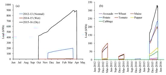 Figure 6 shows a summary of the estimated loads of the motor pumps when utilized for irrigation. Typically, we expect the cereals to induce higher electricity loads than other crops, due to their higher water requirements and larger planting areas; see Figure 6b for wheat. In support of our foregoing argument, it was evident that the loads were extremely high during the drought year (that is, the 2015–2016 irrigation cycle). Nonetheless, for time periods with typical conditions, such as the 2012–2013 irrigation cycle, the supplemental water requirements were generally low (see also Figure 5 and Figure 6a).