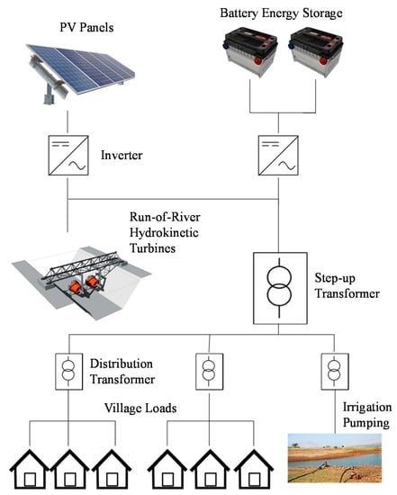 Microgrid projects incorporating VRE sources in rural areas are commonly met in the literature (e.g., [,,]), and numerous feasibility and case studies of their use have been conducted with varying power sources and loads. The research effort by [], in particular, was unique in its consideration of sociopolitical security with reference to the use of renewable energy technologies in Sub-Saharan Africa.