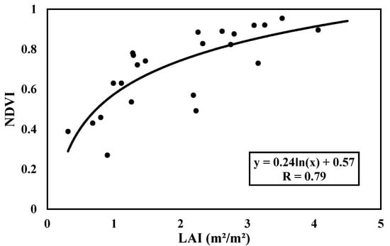 Relationship between LAI in situ measurements and normalized difference vegetation index (NDVI) derived from Sentinel 2 images.