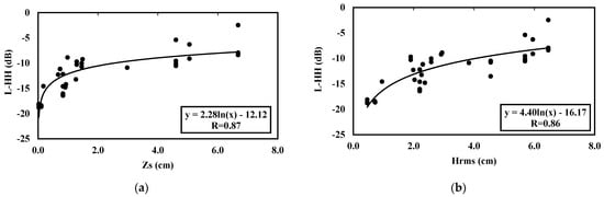 The roughness effect is introduced by a logarithmic regression between the Hrms or Zs parameter, defined as Hrms2/Lc [], and the radar signal. This empirical relation is generally considered to be logarithmic because of the strong saturation of the radar signal for high roughness levels [].