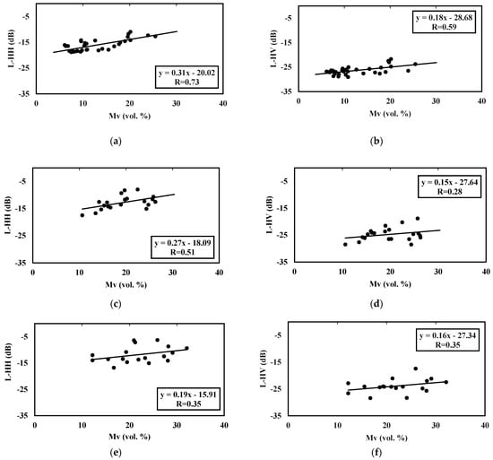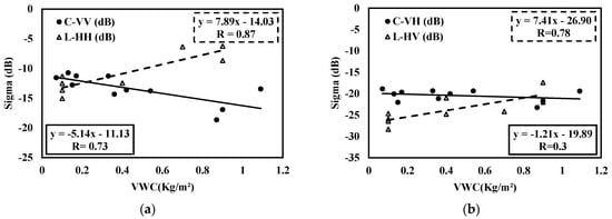 The application of this WCM option in cross-polarization concerns only the g soil semi-empirical model. In this case, the results are strongly degraded compared to the results in C-VV and L-HH, with accuracies (RMSE) on the order of 13 vol.% for the ALOS-2 data and 7.1 vol.% for the Sentinel-1 data. These results are consistent with previous studies showing the poorer accuracy of moisture inversion using cross-polarization. They are also consistent with many studies showing the importance of taking into account the soil–vegetation interaction component in the simulation of canopy scattering for the case of a cross-polarization configuration.