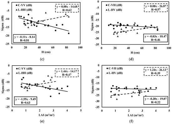 The NDVI values show moderate correlations with R values of 0.74 and 0.59 for H and VWC, respectively. Figure 2 illustrates this strong relationship between NDVI and LAI, generally considered for modeling of the vegetation backscattering contribution, with a high correlation equal to 0.79. We consider NDVI as a key parameter for describing vegetation cover, basing on the results observed in many other studies [,], in the remainder of this study, concerning backscattering and inversion models.