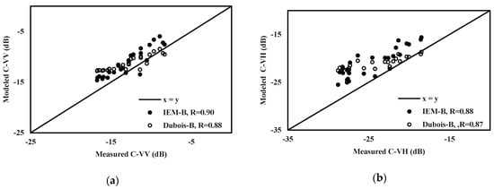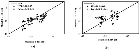 A modified version of the Dubois model (Dubois-B) was proposed by [] in the three polarizations of HH, VV and HV to minimize the discrepancy between simulated and real backscattering coefficients. For HH, VV and HV polarizations, expressions are written as follows: