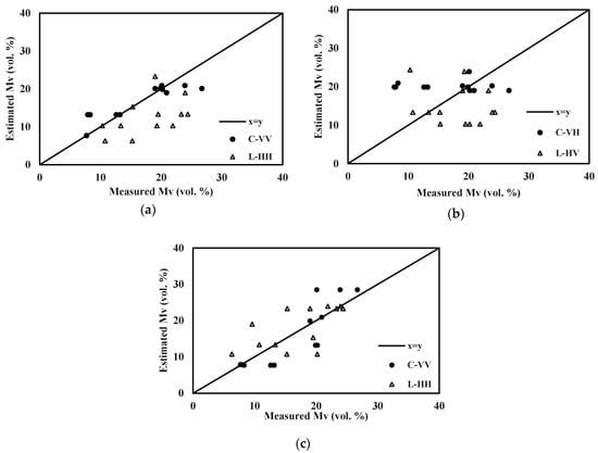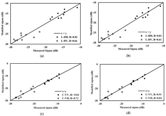 Figure 9 shows the inter-comparison between the in situ soil moisture and estimated values for the application of WCM option 2 with different types of soil scattering models at the L- and C-band frequencies. Each point corresponds to one tested field.