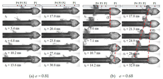 Figure 5 shows the evolution of the natural cavity morphology at 10 different moments under four cavitation numbers, in which the direction of the incoming flow is from right to left. When the cavitation number is equal to 0.81, there are only a few micro-sized vapor bubbles near the shoulder. From Figure 5a, it is found that when σ = 0.81, because the cavitation number is large at this time, the cavity length, cavity shedding scale and fluctuation amplitude are small, and the cavity develops and covers the sensor P1 at this time. There is no obvious natural cavitation from sensor P2 to sensor P4; Figure 5b is the evolution process of the cavity shape when σ = 0.68. Relatively stable sheet cavitation is observed, but there are unstable fluctuations in the enclosed area of the cavity. As it causes the most severe pressure fluctuations and instabilities, special emphasis will be given to sheet/cloud cavitation. From t0 to t0 + 3.6 ms, the cavity is in a relatively stable state and a re-entrant flow is generated at the tail of the cavity, as shown in the red vertical dotted line. From t0 + 7.1 ms and t0 + 14.2 ms, as the re-entrant flow from the tail of the cavity develops into the cavity, the shoulder cavity gradually break off and sheds, and at the same time, some small-scale shedding cavity clusters are produced, as shown in Figure 5b by the red inclined dotted line F. From t0 + 17.8 ms to t0 + 32 ms, the shedding cavity gradually moves downstream (see the red dashed line G), and the shoulder cavity gradually grows to its maximum size (see the red dashed line H). At the same time, the cavity continues to move to the downstream high pressure zone, the shedding cavity group gradually collapses, the cavitation on the fractured shoulder gradually grows and reaches the maximum, and the cavity is temporarily stabilized and the next shedding cycle begins to develop; Figure 5c,d show the evolution of a cycle of cloud cavitation when σ = 0.62 and σ = 0.52, and the evolution of the overall cavitation shape under the two low cavitation numbers behaves similarly to that when σ = 0.68. The shoulder is produced and gradually grows, eventually breaking at the end of the cavity. As the cavitation number decreases further, we can find that more violent void growth/shedding occurs, which is called sheet/cloud cavitation. It is worth noting that the decrease in the cavitation number increases the length of shoulder cavitation, the duration of one cycle increases, and the shedding cycle becomes more obvious: