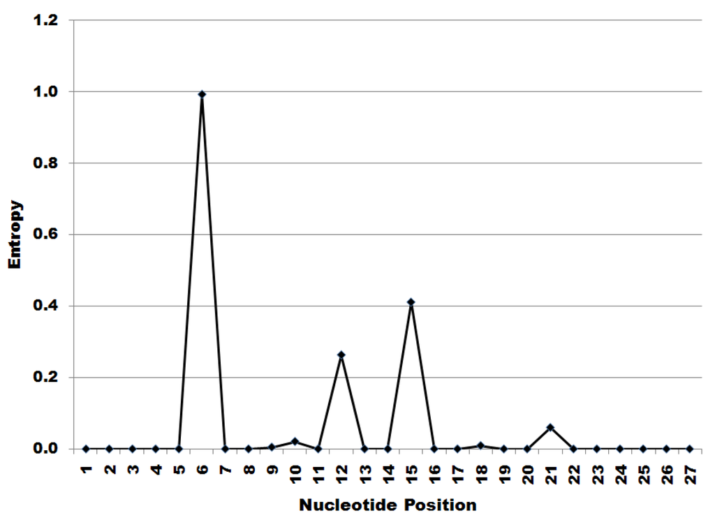 The first 27 nucleotides at the 5’ start of all 2489 downloaded segment 7 sequences were translated and it was found that 100% of the nucleotide sequences in the dataset encode the peptide MSLLTEVET. The information entropy at those encoding nucleotides is shown below in Figure 1. Since the amino acid sequence of the translated peptide remained constant, the peaks in entropy shown in Figure 1 indicate synonymous substitutions in nucleotide sequence.