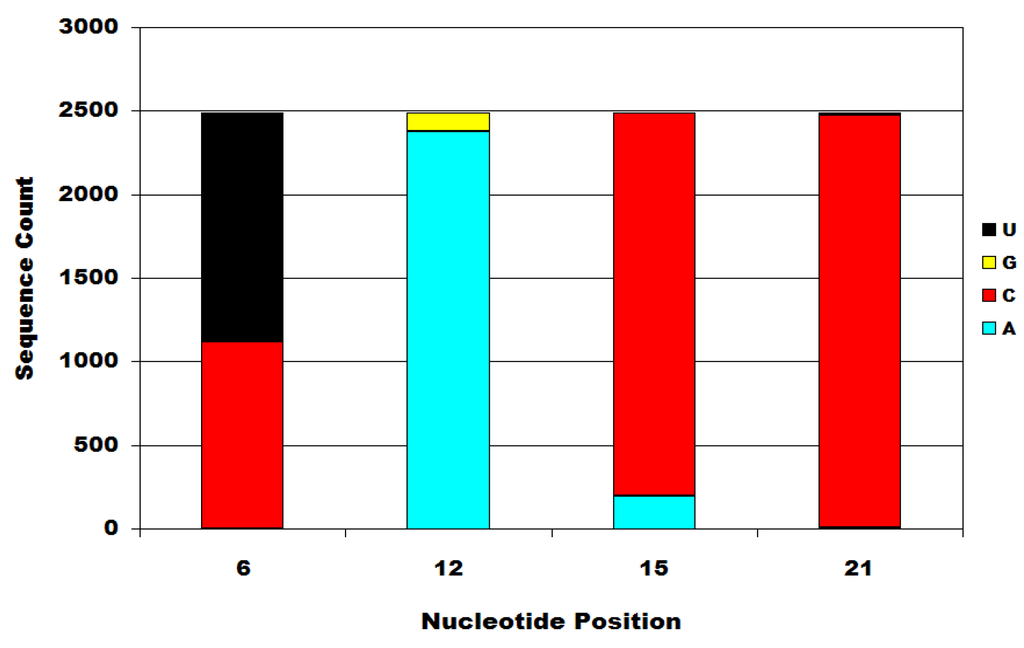 As shown in Figure 2, 55% of the sequences contained uracil at position six (U6) and 45% contained cytosine (C6), 96% contained adenine at position 12 (A12), 4% contained guanine at position 12 (G12) and 8% contained adenine at position 15 (A15). In addition, two sequences (0.08%) at position 12 had synonymous A=>U transversions. The entropic peak at position 21 is caused by transition substitutions and both types of transversion substitutions, with a combined frequency of 0.60%. The very low incidence sequences were ignored and the sequences in the dataset were classified and assigned to subsets for further analysis as follows: U6, C6, A12, G12, A15 and C15. Statistical descriptions of these six subsets are given below in Table 1.