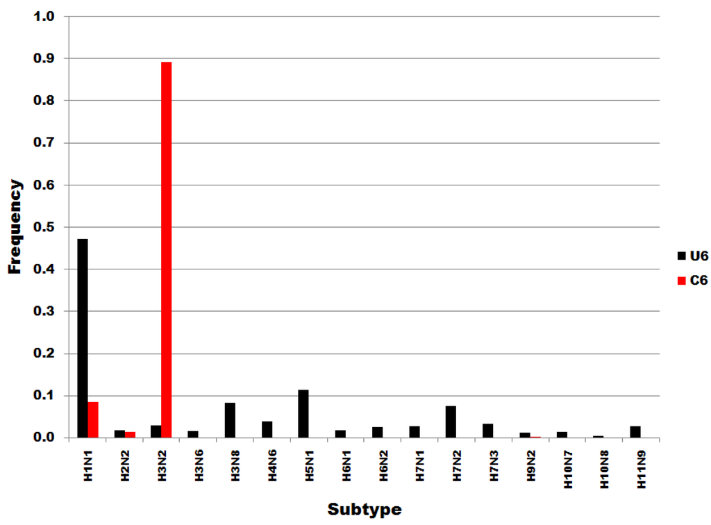 Figure 3 shows that the distributions of U6 and C6 subset sequences to subtypes do not correspond or correlate. Members of the U6 subset of sequences are distributed widely throughout the subtypes. In contrast, C6 variants are most common in H3N2 subtypes. Not one of the H5N1 sequences was a member of the C6 subset, i.e., all 125 H5N1 sequences in the dataset were of the U6 variety. The results in Figure 3 show that the single nucleotide substitutions determining membership in sequence subsets U6 and C6 are associated with biological processes that determine viral subtypes.