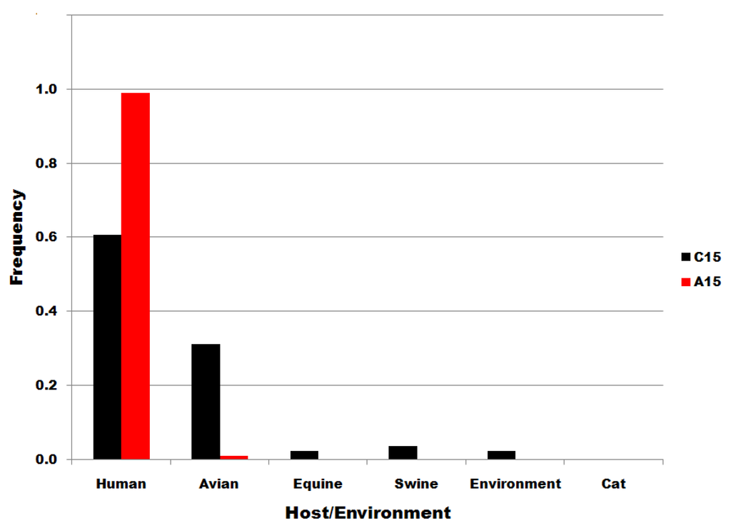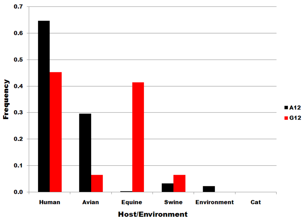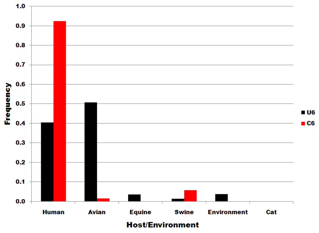 The distributions of subset U6 and C6 sequences to host species and to environmental viral sources are shown in Figure 4. There is no significant correlation/correspondence between the distribution of subset U6 and C6 sequences to host species or environmental viral source. Members of the U6 subset of sequences predominate in birds but are also distributed widely to various host species and in environmental viral sources. C6 variants are the most common in human infections. The results in Figure 4 show that the single nucleotide substitutions determining membership in sequence subsets U6 and C6 are associated with biological processes that determine infectivity in various species, including man.