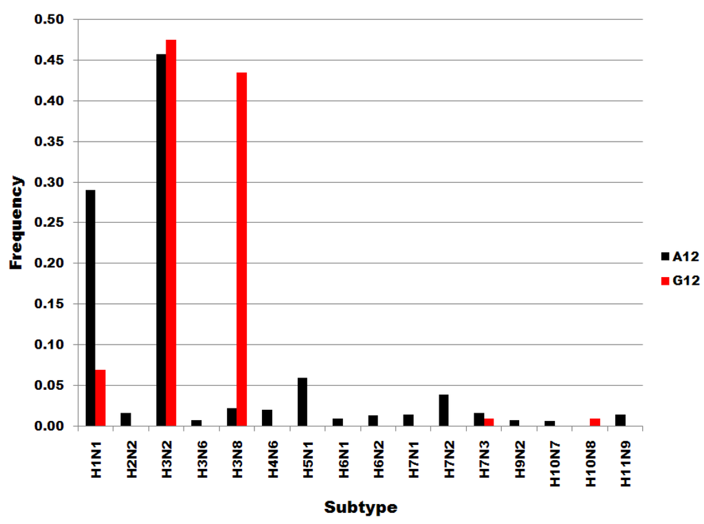 Table 3, below, gives the results of an analysis of possible correspondences between the distributions of sequences to viral subtypes and to viral host species in subset pairs at nucleotide positions six, 12 and 15. The Kendall tau for correlations/correspondences between subsets at position six is only 0.05 for distributions to subypes and 0.28 for distributions to host species, with associated probability values greater than 0.05 (0.79 and 0.44, in parentheses). As shown in Table 3, the null hypothesis cannot be rejected for any Kendall probability for the U6:C6 subset pair, even for the joint subtype:host probability (0.3431), i.e., there is no significant correlation/correspondence between position six subset sequence distributions. In contrast, there is a significance correspondence between the distribution of A15 and C15 subsets to viral host species (Kendall tau = 0.77, p =0.0290). Moreover, the joint probability of the host and subtype distribution probabilities for the U6:C6 subset pair is 34 times greater than for the A12:G12 pair (0.3441/0.0113) and 214 times greater than for the A15:C15 pair (0.3441/0.0016). Thus, the data in Table 3 show that U6 and C6 sequences, each 982 nucleotides long and assigned in this study according to a single position, form subsets that distribute to subtypes and viral host species without correlation/correspondence. The U6 and C6 frequency distributions are shown below in Figure 3 for subtypes and in Figure 4 for host species. The distributions for positions 12 and 15 subtypes and hosts are shown in supplementary data.
