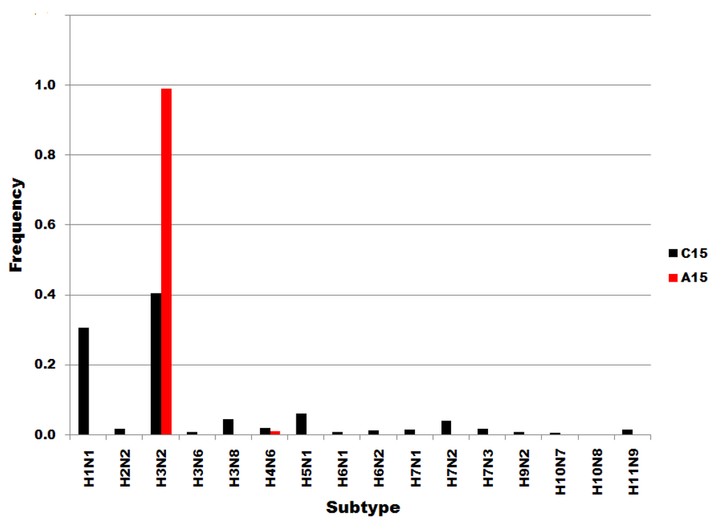 Influenza A subtype frequencies in segment 7 position 15 subsets. Subsets are denoted in the legend. Frequency, normalized to each subset total count, is on the ordinate.