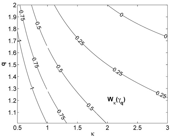 We display the relationship between our two parameters q and . They range within the and upper values here indicated, below the “0-contour-curve".