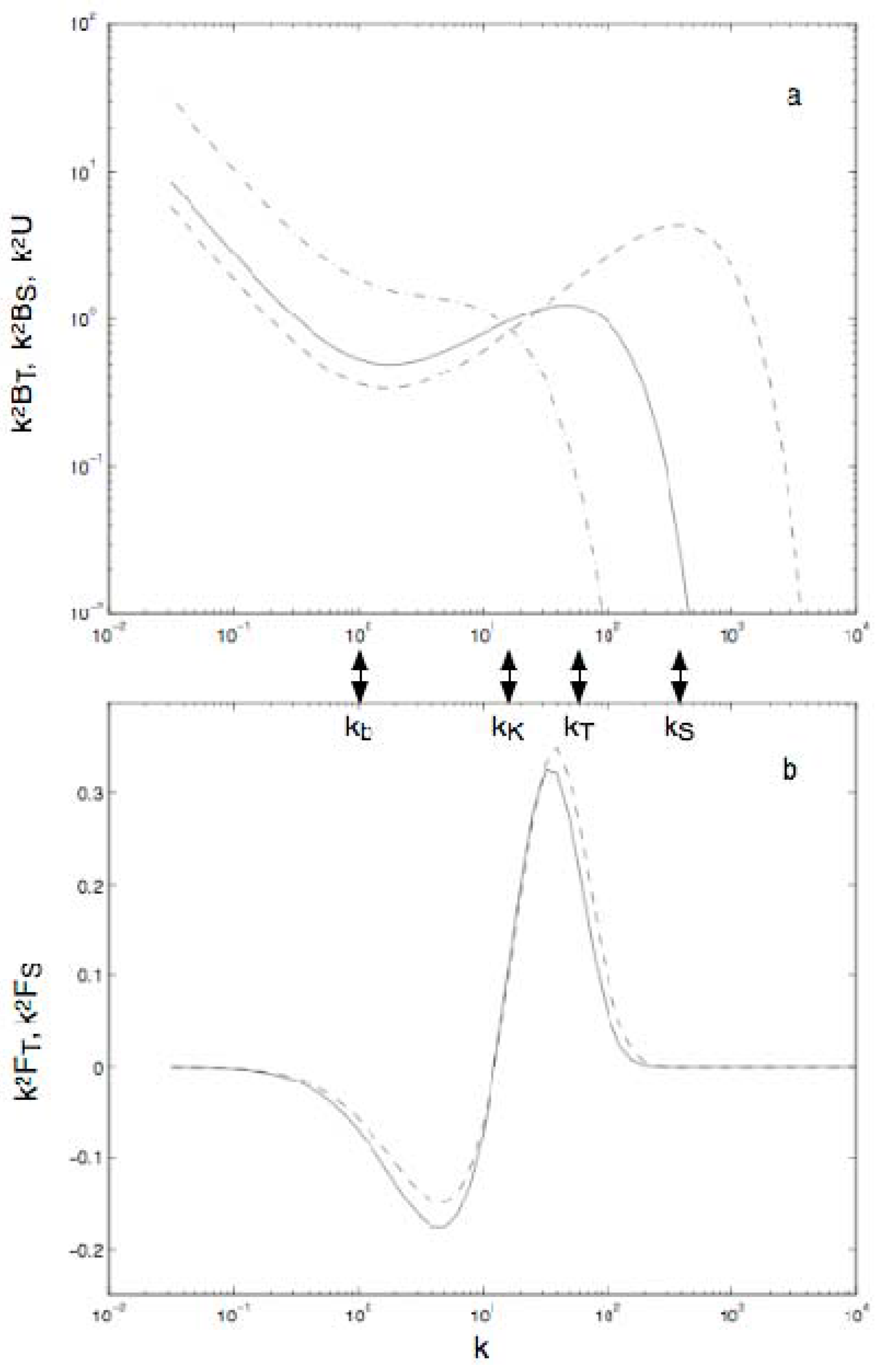 Details of this F are uncertain. We cannot say, e.g., at precisely what k the sign of F changes from F < 0 at lower k to F > 0 at higher k, and we do not know how effectively wave propagation suppresses |F| at yet lower k [73]. What is stunning though is how strongly this theoretical result contradicts traditional thinking. We anticipate F < 0 over scales for which it was supposed F ≈ 0. We anticipate F > 0 over scales for which it was supposed F < 0. Thus “turbulence”, over k > kb is not expending kinetic energy to mix buoyancy downward but rather the turbulence is being excited by release of potential energy as buoyancy “re-stratifies” (upwards flux). Is all of this very strange? No. F is only taking the sign of positive entropy production, i.e., following the Arrow of Time.