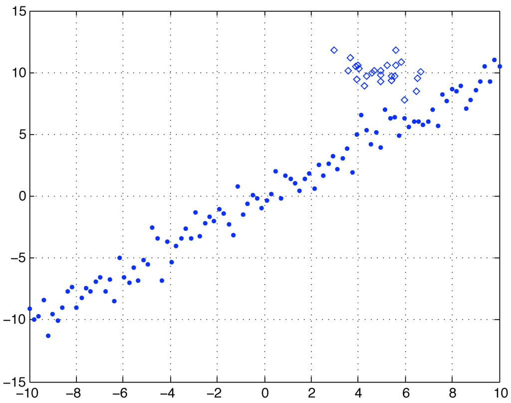 As a first toy example to investigate the properties of the proposed cost function H as compared to the Least Squares (LS) and Least Median of Squares alternatives, consider the data set depicted in Figure (1): there are 100 points depicted as dots having coordinates equally spaced in the range . The coordinates are computed as being ϵ a Gaussian random noise of zero mean and unit variance. Moreover there are other 25 data points depicted with a diamond shape: these have coordinates normally distributed with mean 5 and unit variance, while their coordinates are normally distributed with mean 10 and unit variance. The total data set is made of the these 2 subsets, namely it contains 125 points that can be thought of as 100 values satisfying a linear model (with some noise), plus 25 outliers.