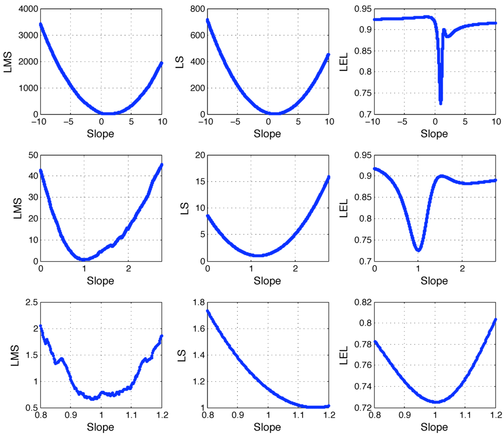where is the sample median over the set in argument and . The LS cost in equation (55) is normalized such that whereas the LEL cost function in (56) is the H function of equation (42) except for checking if is null or not (unnecessary in practice). These cost functions are sampled in the range with equally spaced values of the slope θ: the resulting plots are depicted in Figure (2) at different zoom levels. As expected, the LS cost has a (unique) minimum in . The LMS cost has a discontinuous and rather erratic behavior making it difficult to accurately determine where its minima are. The LEL cost function has a regular plot (the function is actually smooth in this case) and it appears to have a sharp local minimum in . Notice that the LEL function has also a local minimum close to confirming the local nature of the proposed estimator. To explore the behavior of the proposed approach on a multidimensional problem, consider the following model: