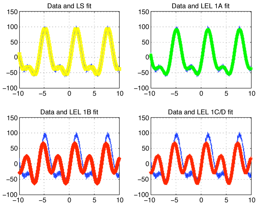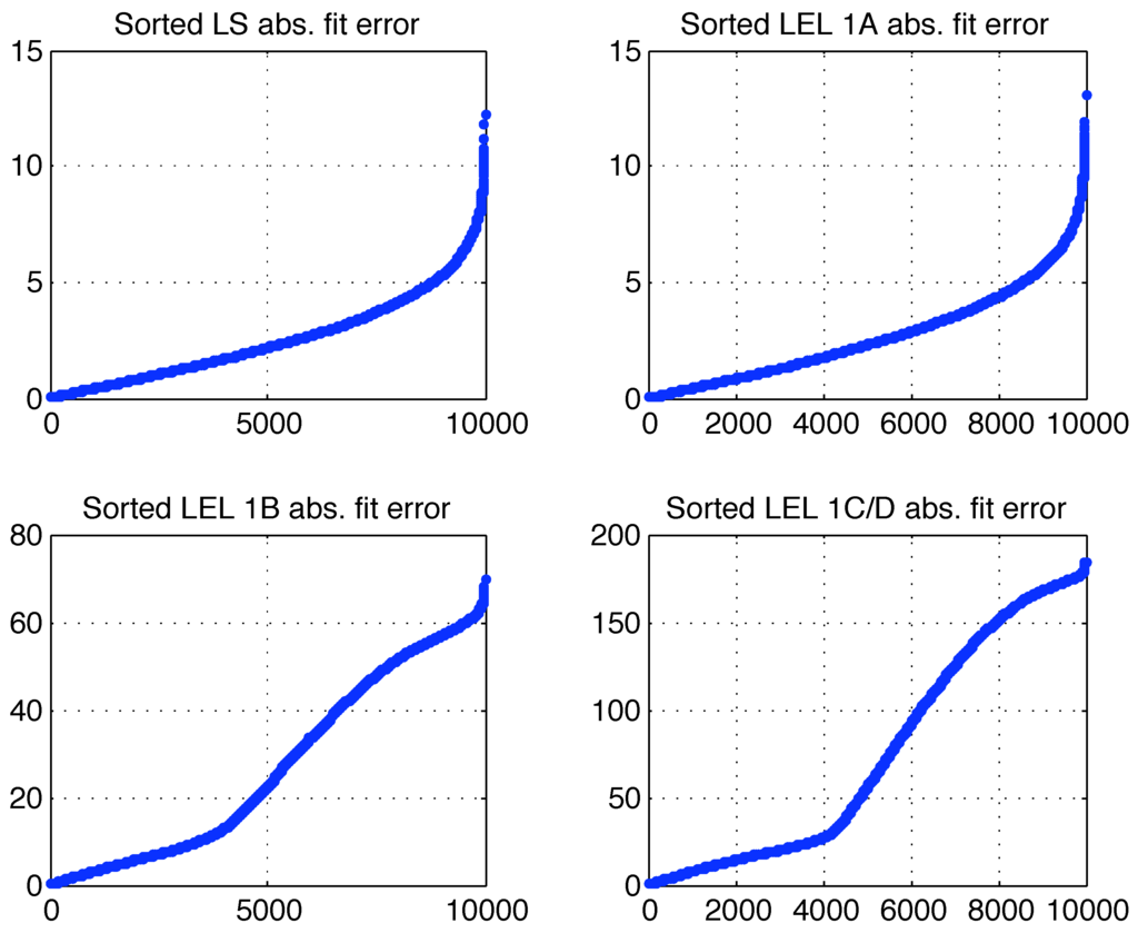 The LEL-1A estimate is very close to the LS one (that is very close to the real parameter vector ) and in Figure (3) the fitted data and appear to be almost perfectly overlapping with the original data (first row in Figure (3)). To the contrary, the fitting behavior of the other two LEL estimates is clearly less accurate. A quantitative criteria to determine unambiguously which of the four (LS, LEL-1A, LEL-1B, LEL-1C/D) estimates is the “best” can be the value of the median of the fitting errors. More precisely, the median of the absolute fitting errors or of the squared fitting errors. These values are reported in Table 2.