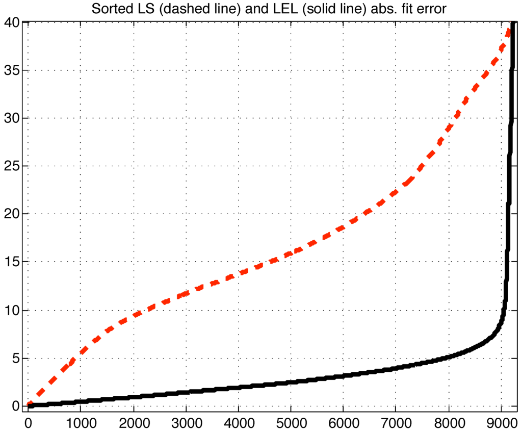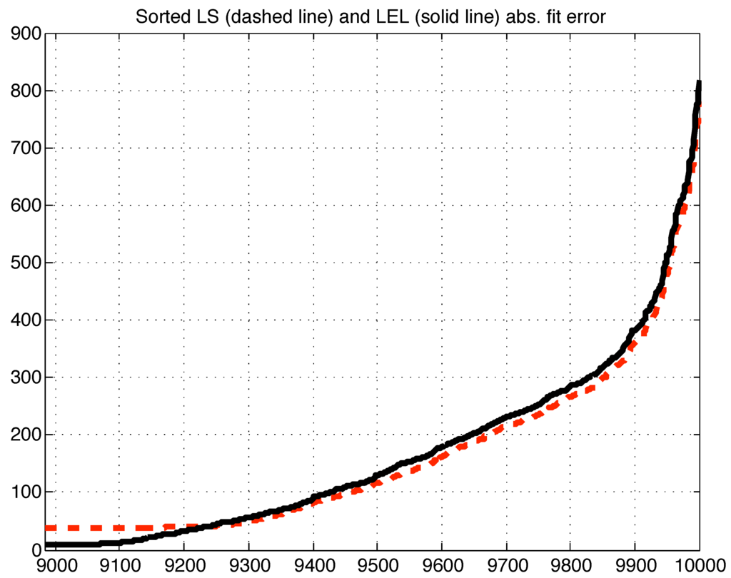 Last 1000 sorted LS (dashed line) and LEL (solid line) absolute fitting errors (i.e., residuals).