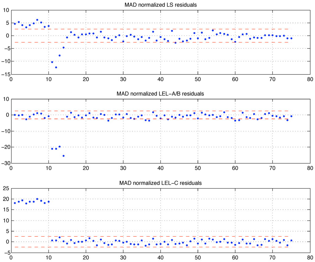 The A and B estimates coincide and correspond to the least value of H among the three. Hence the best (local) LEL estimate of is to be considered . Nevertheless, interestingly this estimate does not correspond to the least value of the median of squares cost. The estimate performs better in terms of the median of squares cost criteria. For a graphical interpretation of these results, refer to Figure (9) where the residuals, scaled by their median absolute deviation MAD (21) scale estimate, are depicted. Comparing the bottom plot in Figure (9) with the equivalent plot for the LMS estimate in [1] (p. 95), one can arguably conclude that the estimate is (very) close to the LMS one. This shows that the LEL and LMS criteria differ and should not be considered equivalent, although in spirit both are defined so that the residual scatter is somehow minimized. The Hawkins–Bradu–Kass example also shows that the LEL estimate can be affected by the presence of bad leverage points (outliers): notice that the central plot in Figure (9) reveals how the (best) LEL estimate (A/B) accommodates the 10 bad leverage points within the fit and excludes the four -space outliers 11, 12, 13 and 14. Although from the LEL criteria perspective one could also argue that the first 10 points are not outliers (or bad leverage points), whereas the following 4 are. Indeed the very definition of outlying data should be given according to a fitting criteria. The interpretation of similar results without an a priori agreement on the definition of outlier will always be debatable.
