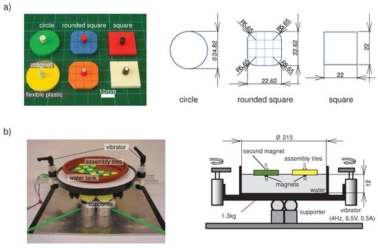 In order to evaluate the role of morphology in the self-assembly process, we constructed an experimental platform, which consisted of floating tiles equipped with magnets, and a water tank with two vibrators (4 Hz, 6.5 V, 0.5 A) that induced turbulence on the water surface and thus provided randomness (Figure 1 b, total weight:1.3kg). We developed tiles with three different shapes (Figure 1 a): circles, squares, and squares with rounded corners. They were of identical weight (0.2 g), surface area (484 mm) and thickness (2 mm). These shapes were selected after noting that a change in one variable coding the morphology, e.g., surface area, tended to affect the other dependent variables, e.g., diameter, shortest distance between edges and magnets.