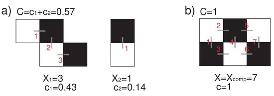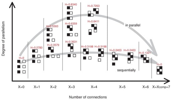 As an illustration of the DOP, consider the situation with an assembly of six tiles, depicted in Figure 3. In the figure, we classify and depict different configurational clusters, according to the number of total connections X. We show each possibility among similar topological clusters, and align considering the number of formed clusters. The figure tells that as X increases, the DOP H increases, attaining a maximum for or , and then decreasing to 0 for . Also, in each column (that is, within a group having the same number of connections), the more equally clustered, the higher the DOP. In other words, high values are derived from states in which the connections are equally distributed.