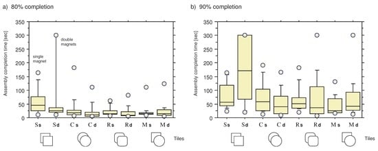The assembly completion time (completion of over 80% in (a) and 90% in (b)) of all trials are displayed in Figure 4 as a box plot. All the measured data are listed in the Appendix. The boxes on the left side of each column show assembly completion times for single magnet tiles, and on the right side show the times for double magnet tiles. We show the lower quartile (Q1), median (Q2), upper quartile (Q3), and the average of each combination in Table 1. The trials for which we did not observe convergence in a certain amount of time (>300s), are included as 300 s (2 trials in completion, 5 trials in completion, 1 trial in each of and completion).