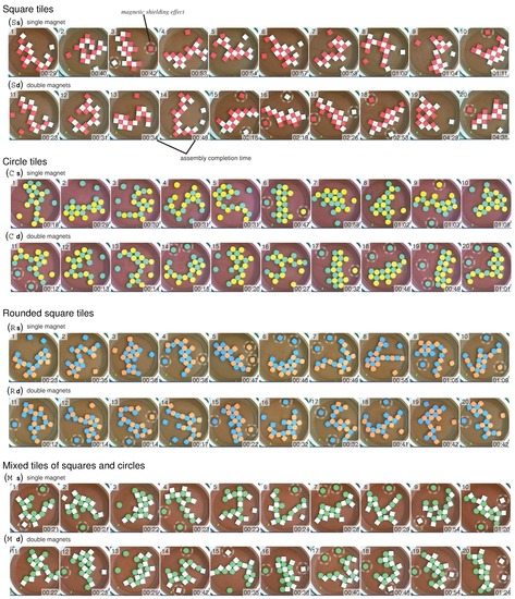 We carried out 15 iterative trials for each of 4 different combinations; square tiles and square tiles ( hereafter, ·is either : with a single magnet or : with double magnets), circle tiles and circle tiles (), rounded-square tiles and rounded-square tiles (), and square tiles and circle tiles ().