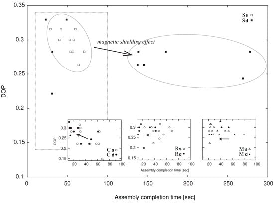 Comparison of DOP against the assembly completion time. Considering the wide time range that square tiles took to complete, we displayed the other combinations in small windows, whose corresponding area is shown as a dotted square.
