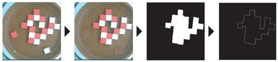 There have been numerous attempts undertaken in various fields. A pioneering approach was taken by Penrose about 50 years ago []. He developed a mechanical self-replication model, which operated in a stochastic manner. Aggregation patterns of passive self-assembly were raised into prominence and employed by Hosokawa et al. [,]. He examined the effect of active elements on the aggregation. Whitesides and his group investigated many self-assembling and self-organizing phenomena at different scales [,,,] and categorized them into static, dynamic, templated, and biological self-assemblies, depending on the energy dissipation. Seminal ideas about conformational switching were proposed by Saitou []. He proposed a reactive mechanism for 1D self-assembly and assessed the functionality with kinetic rate equations. The units he designed feature mechanical internal states, such that the units react differently to their inputs, whereas the system is purely passive with respect to physical causation.