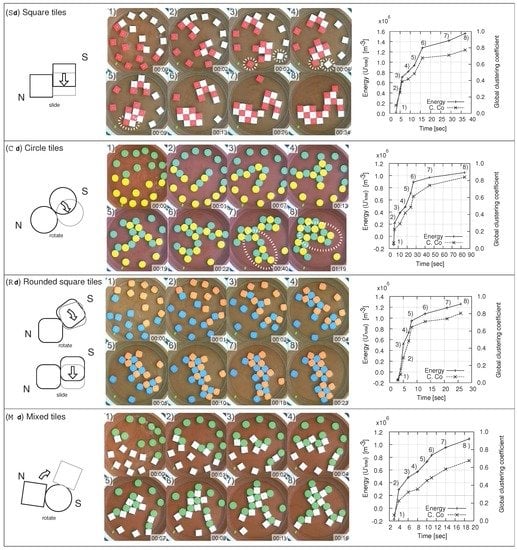 In Figure 9, we selected one of the representative aggregations in which more than of tiles were aggregated from each combination and displayed (the respective final configurations can be seen in Figure 5 13, 16, 15, and 11). For each case of the raw data, we present the time sequence of trials listed from the left top to the right bottom (with an illustration of the most discriminative movement of the set on the left side). On the right side, we show the transitions of the magnetic potential energy and the clustering coefficients. We discuss each case individually: