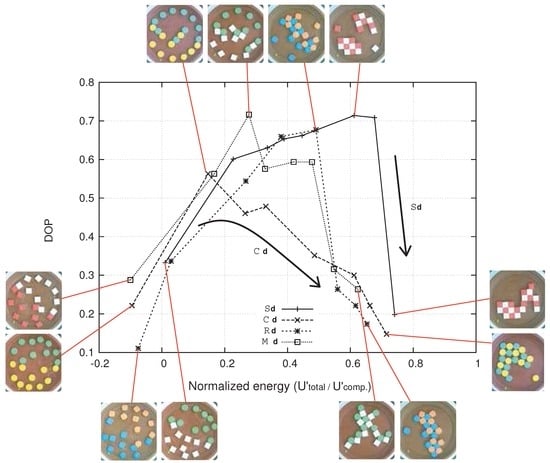 In Figure 6, we plotted the DOP of all final configurations versus the time they took to complete. Considering the wide time range that square tiles took to reach a complete assembly, we displayed the other combinations in small windows, whose corresponding area is shown as a dotted square. An increase of DOP was observed for and a decrease was observed for . This suggests that the combination of circular shape with a strong interaction force works not only to accelerate the aggregation speed but also works to achieve a dense structure. Changes were rarely observed with and . The addition of a magnet has several meanings depending on the perspective that is described. In this work, adding a magnet corresponds not only to enhancing the attractive forces among the tiles, which was considered to relatively decay the effect of morphology of the shapes, but also to enhance the effect of shape especially once they connect. That is, it positively influences both the long range interaction due to magnetic forces and the short range interaction through the local shapes.