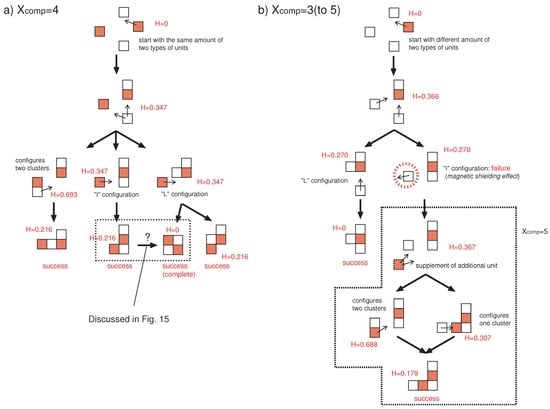 For further investigation, we show two representative convergence paths with 4 square tiles in Figure 13; starting with 2 red and 2 white tiles in (a), and 1 red and 3 white tiles in (b). Here the orders of the paths are expressed with arrows. Each DOP H is also shown for the formed cluster. Surprisingly, in Figure 13a, all paths allow the system to converge. That is, the system has little influence of the magnetic shielding effect, and always completes the aggregation process. However, in Figure 13b, the system has the possibility to be trapped by the problem and doesn’t manage to converge to a single cluster (i.e., a white square tile highlighted with red dotted circle). However, this occasion can be avoided if there is another opponent tile in the system (the dotted red square tile; “supplement of additional unit”). Once this tile is added to the system, no matter to which direction that the system proceeds to assembly, it never encounters the problem. This indicates that having a similar number of sets of opponents on a regular basis helps a system to fall into a local minimum. It also explains why systems proceeded with a fast aggregation in the early stages in the experiments.