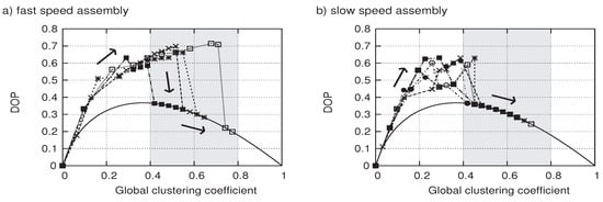 The DOP transitions of square tiles (Figure 5 ) vs. the change in global clustering coefficients. a) Transitions whose assembly completion times () are less than one minute (Figure 5 11 - 14). b) Transitions which took more than two minutes (Figure 5 15 - 20). In the case of rapid transitions, the tiles tended to form two clusters and subsequently aggregated and configured a cluster. This tendency can be observed as large DOP reductions in the second half stages of their transitions, where the global clustering coefficients are between 0.4 and 0.8 (highlighted with a gray colored background).