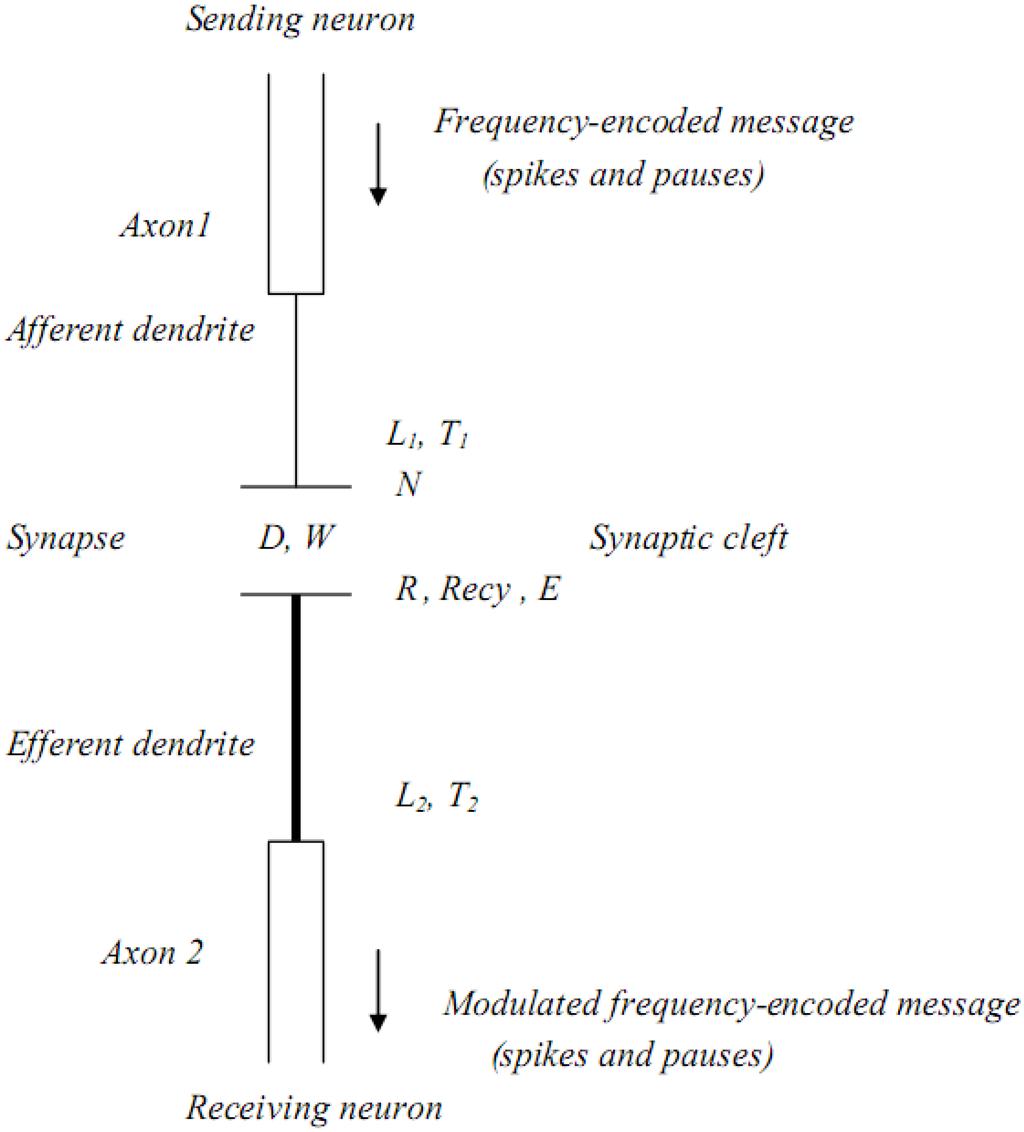 In this illustration, the length (L) of each dendrite, thickness (T) of each dendrite, synaptic cleft distance (D), and synaptic cleft width (W) are all seen to be potential structural sites of signal modulation. At the synapse itself there are additional chemical and biochemical sites for modulation. These include the rates and types of neurotransmitters (N) released, the number and types of receptors (R) available, energy (E) availability and the enzymatic and/or transporting mechanisms available for neurotransmitter recycling (Recy). These latter components can delay, and/or alter the frequency of transmitted messages in that they govern the rate of clearance of neurotransmitters, and therefore affect the synaptic re-polarization time [29]. If the synaptic re-polarization time is greater than the message frequency, the frequency will be truncated and affect the signal that reaches the receiving neuron [8,30].