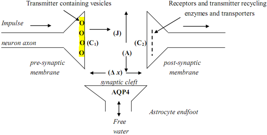 In Figure 2 the basic structure of a chemical synapse is illustrated, as well as how Fick’s law interacts with how a transmitter diffuses across the synaptic cleft. Fick’s law; J = DA [C1- C2/ Δ x] incorporates the rate of diffusion (D) of the hydrated transmitter, the width of the synaptic space (Δ x), the cross-sectional area (A) of the space, and the concentrations of transmitter at the pre-synaptic membrane (C1) and post-synaptic membrane (C2), with [C1- C2/ Δ x] being the transmitter concentration gradient. (J) is the rate of mass movement of the transmitter whose time of arrival at the post-synaptic membrane is a function of (Δ x). Surrounding the synapse are astrocyte endfeet rich in aquaporin-4 (AQP4) water channels. If (Δ x) changes, the timing of information-embedded signal trains arriving at the post-synaptic membrane will be altered and normal cognition may be impaired. Astrocyte AQP4 water channels play an important role in this timing process in that they effectively regulate the water content of the synaptic cleft, thus maintaining its structural stability and the dimension of (Δ x). In this simple representation of a synapse, only a few of the many structural and biochemical variables have been included.