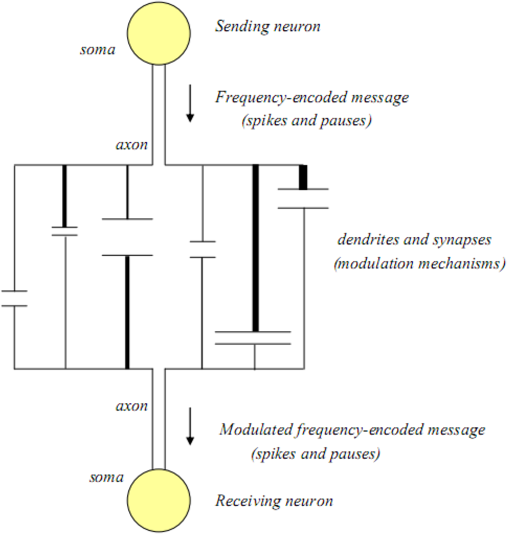 If more than one dendrite and synapse are involved between two neurons, it is highly unlikely that the original message will be received by the efferent neuron in its original spike-pause encoded form. Thus, modulation of the message is probably a major component of all inter-neuronal communications. In Figure 3, an inter-neuronal association with multiple dendritic-synaptic-dendritic connections is illustrated.