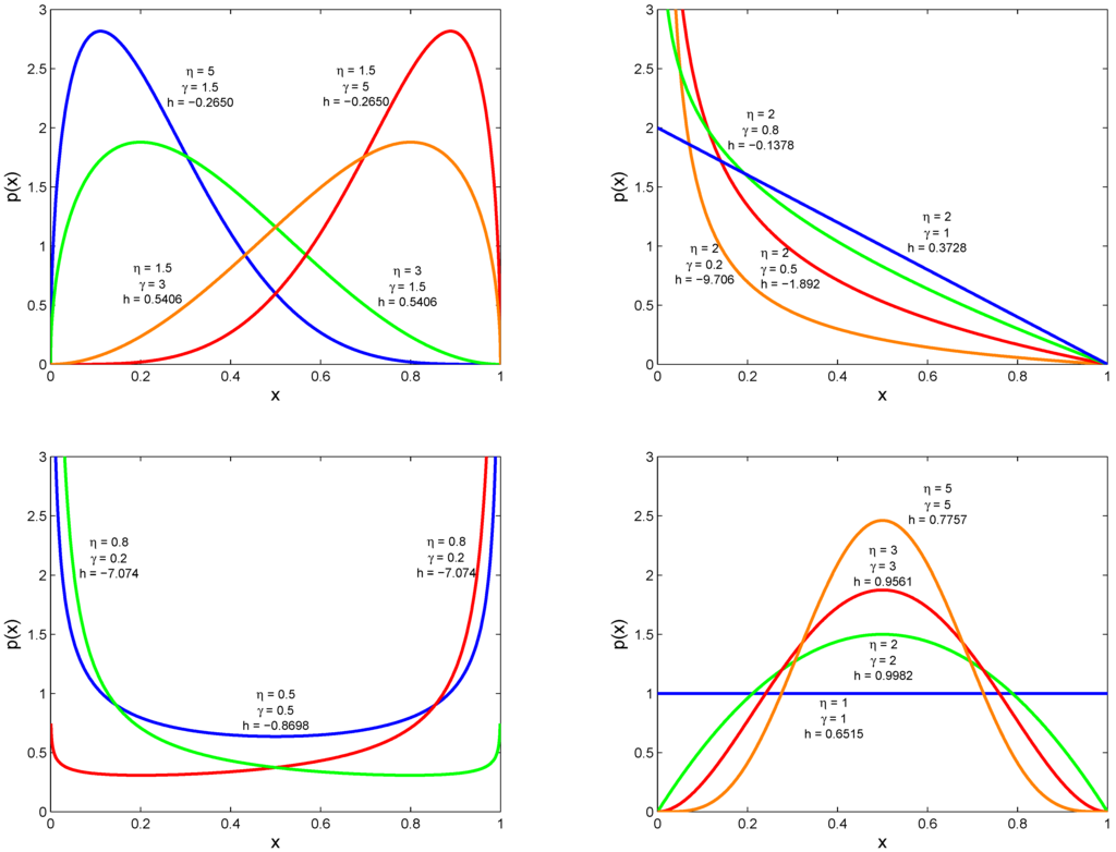 A variety of Beta distributions (taken from Hahn and Shapiro, [15]) are shown in Figure 1, along with the corresponding differential entropy, h, for a sine wave of amplitude . These entropies are expressed in bits, so the values of obtained from Equation (17) are divided by . The last term in (17) is calculated by standard numerical integration techniques.