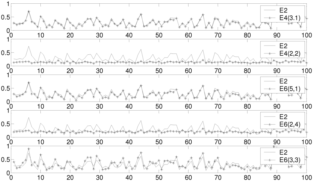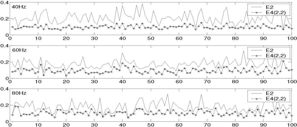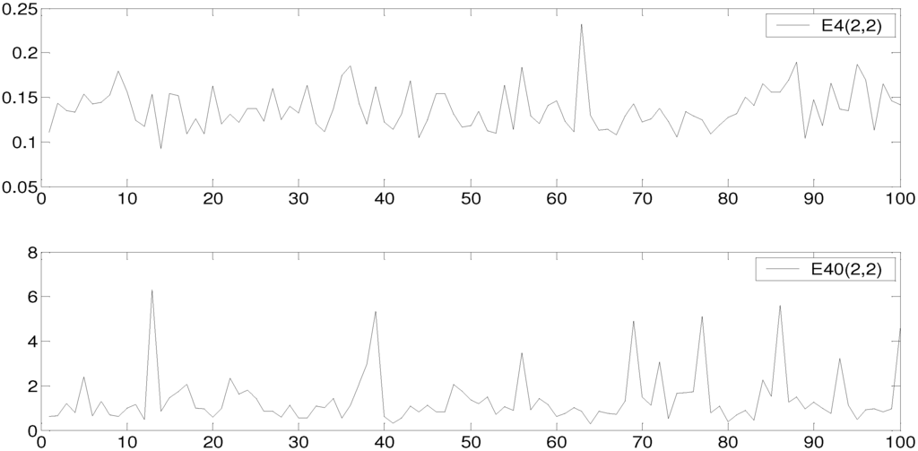 As can be seen from Figure 1, y(4)(yn(2), yn+m(2)) gains the best performance to match the wavelet, the next is y(6)(yn(4), yn+m(2)). Moreover, in our simulation trials, the error variances of using y(4)(yn(2), yn+m(2)) and y(6)(yn(4), yn+m(2)) are very small, about 3 × 10−4 and 5 × 10−4 respectively, others are about 0.01, which implies the numerical robustness.