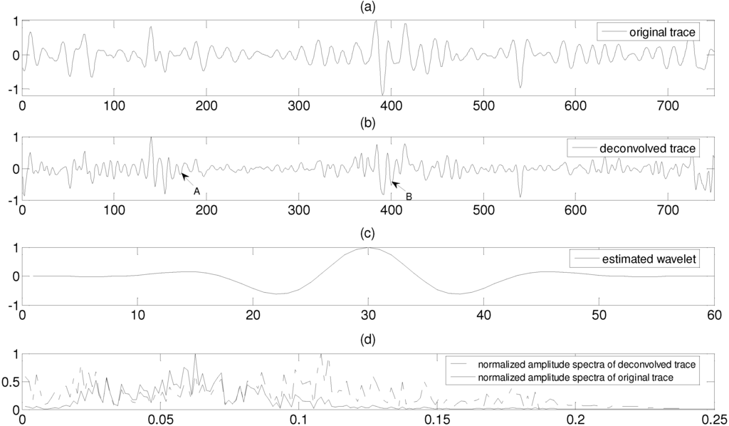 Here, we consider real seismic trace with about 800 samples acquired from the Changqing oil field in China. It is noteworthy that the Wiener filter can achieve an optimum trade-off solution between deconvolution quality and noise amplification [6], so we find the seismic wavelet by our method and then improve the resolution of the seismic trace with the Wiener filter. The results are shown in Figure 5 where: (a) is original seismic trace, (b) denotes the deconvolved one, (c) is the estimated seismic wavelet, and (d) are amplitude spectrum of (a) and (b) respectively.