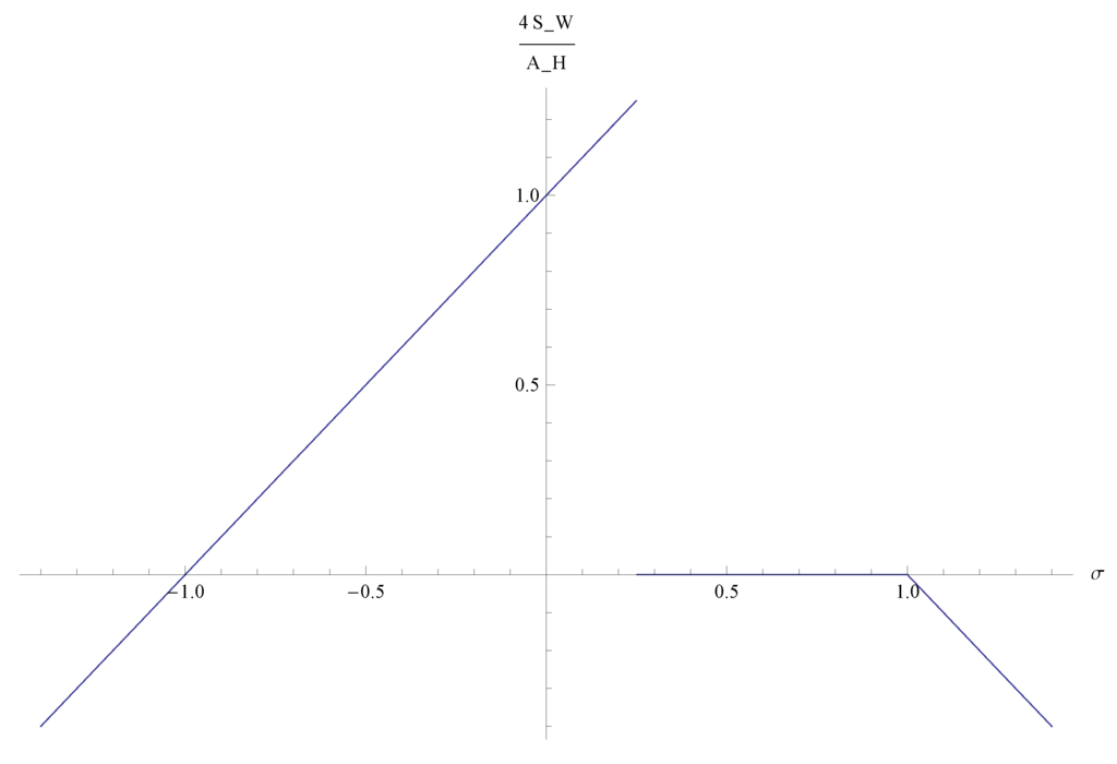 According to (31) the entropy predicted by Wald’s formula restricts considerably the space of the σ parameter with respect to our previous considerations. In fact, as shown by Figure 1, the entropy of the black hole is positive only as far as . For , the entropy vanishes suggesting (but we leave this to the level of a speculation) that, for this value of σ, the number of microscopic configurations realizing the black hole is only one. For , the entropy of Deser’s black hole is always smaller than its value in general relativity. Notice also that for , the entropy function is continuous even if the black hole metric changes. However, as pointed out above, such solution is not physical because of its pathological asymptotic behaviour.