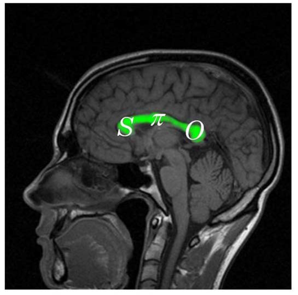 Until recently, with the development of diffusion tensor magnetic resonance imaging (dMRI)—e.g., see Paul, et al. [57] as well as Hofer and Frahm [58]—the inferences of Figure 5 could only be tested against symptomatic observations of persons with focal lesions in the corpus callosum. However, with dMRI it has become possible to map the estimated 190 million axons extending from the neuronal bodies extending from various regions of the cortex through the corpus callosum to the highest level of the neurons of the opposite hemisphere of the cortex as shown in Figure 6. The mapping actually found is indeed consistent with the formula, SπO. Also, as we should expect, focal lesions in the corpus callosum produce symptoms consistent not only with inferences at the global level of neuroarchitecture suggested in Figure 3, but also with considerably more specific predictions flowing from the hypothesized architecture of the corpus callosum suggested in Figure 5 and borne out in Figure 6.