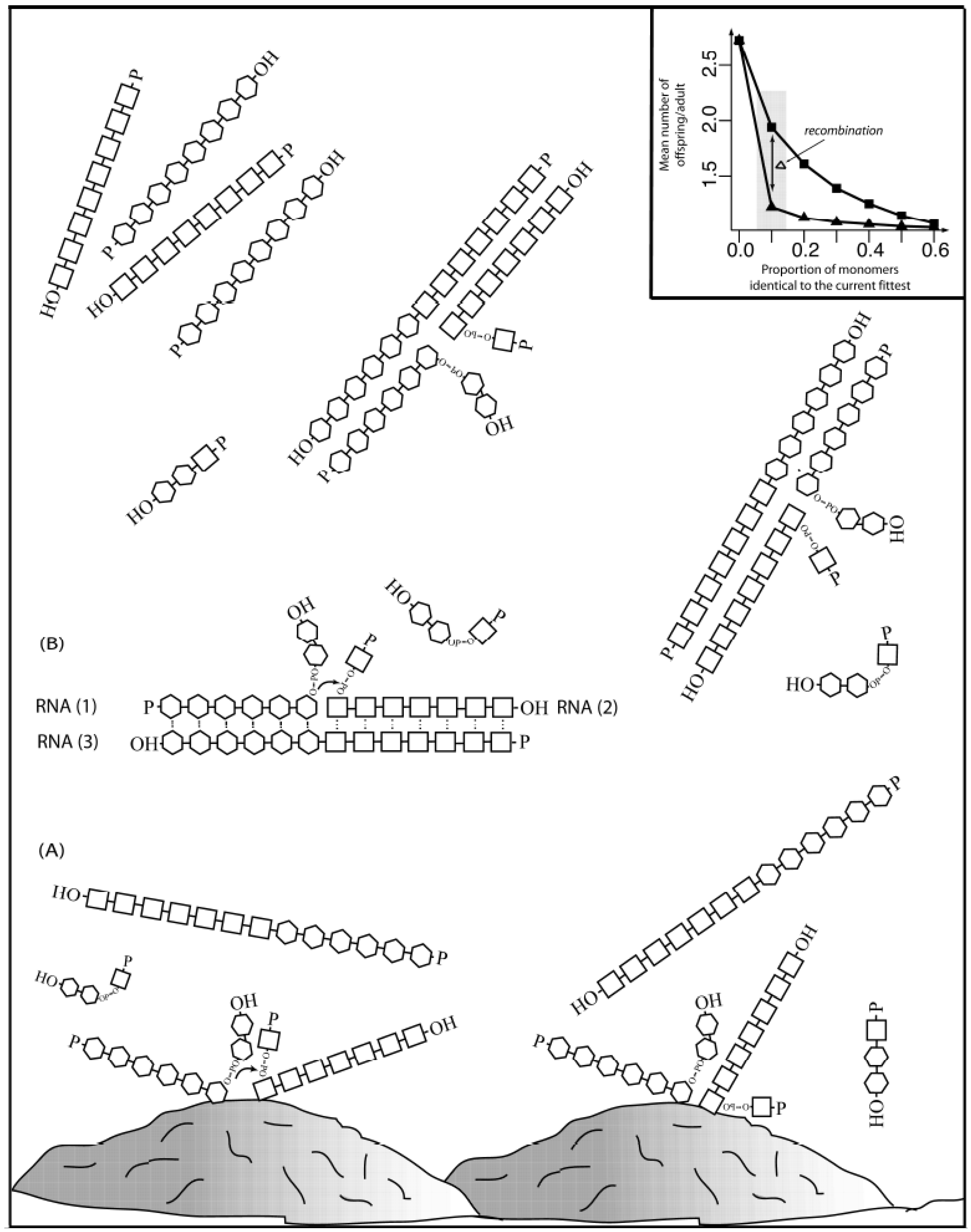 Figure 1 depicts how mineral-aided catalysis (e.g., montmorillonite clay) could have contributed to initiate a recombination event. Random collision of two polymers in the proximity of the clay surface could have facilitated the recombination event (A), giving rise two molecules of different size than the original molecules (Scheme I). A recombinant molecule, in the presence of a steady state supply of polymers (1) and (2) could have acted as a recombinase (3), in a template-aided (by transient interactions shown as dots) transesterification reaction (shown by an explicit phosphodiester bond with a small arrow from the 3’-hydroxyl to the 5’-α-phosphate). The reaction must happen at a fast enough rate before degradation occurs. The first recombinant molecules in solution could have served in template-driven recombination events (B), increasing the concentration of recombinant molecules in a more exponential way. The inset shows how recombination (bottom line with triangles) could increase diversity to a point in which a population of polymers of 100-monomer units long (for example) could have stayed extant if each parent molecule produced as few as ca. 1.22 offspring, with up to 10% of the monomers being identical to the most fit. In contrast, the same population in the lack of recombination (upper line with squares) will stay extant only if each parent molecules produce almost twice the amount of offspring, ca. 1.94.