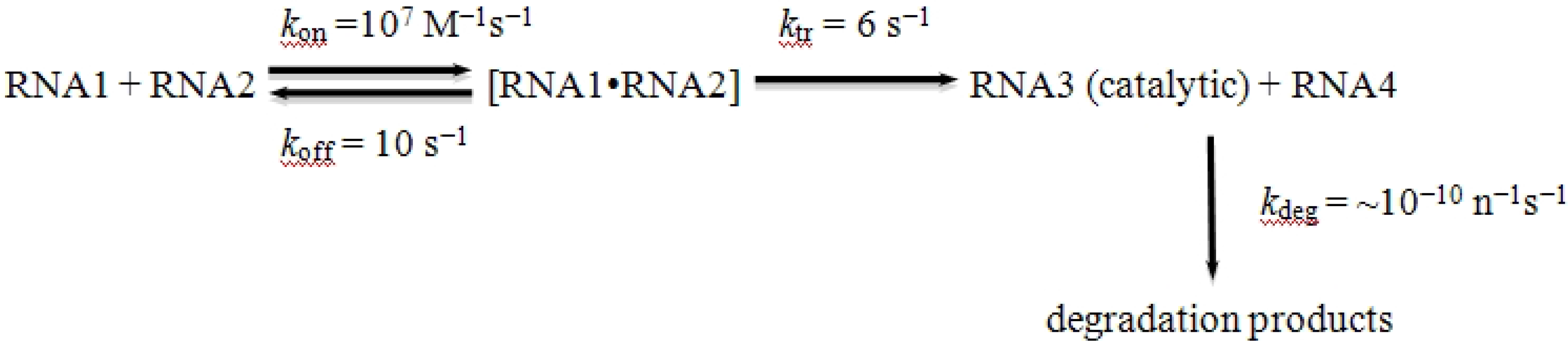 The kinetic model for generation of complexity by recombination also constrains the starting conditions for the RNA World. Autocatalysis is an essential feature of living systems, or, presumably, those on the way to life [34,35]. If RNA3 in the kinetic mechanism shown in Scheme I were itself an RNA recombinase, it would appear that it could catalyze its own formation, as long as there was a steady-state concentration of RNAs 1 and 2 (e.g., Figure 1). Simulations show a different scenario, however. In simulations, an autocatalytic state is not achieved when the ratio between the initial concentration of the complex between RNA1 and RNA2 and the first-order rate constant for degradation is below ~1 M s−1 (see Figure 2 and below). In other words, the finite lifetime of any RNA recombinase means that there is a critical mass of substrate that must be present for it to participate in a self-sustaining autocatalytic process. When the amount of recombining substrate is too low (either through reduced synthesis or enhanced breakdown), autocatalysis can never occur, and the RNA world is doomed before it is born, even if the complex between RNAs 1 and 2 is replenished.