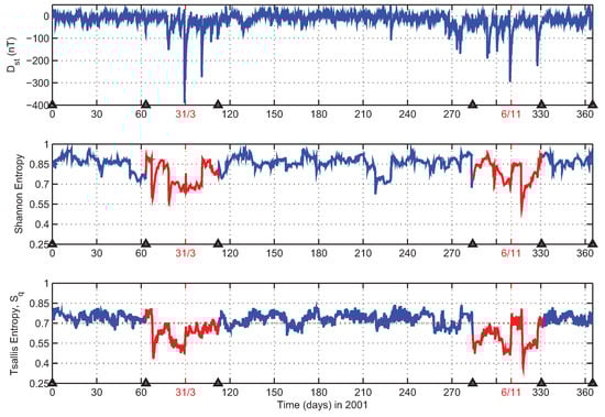 From top to bottom are shown time series along with time variations of Shannon entropies and Tsallis entropies, . Tsallis entropies were derived using a q parameter value of 1.84. The 31 March and 6 November 2001 magnetic storms are marked with red. The triangles denote the time intervals corresponding to the five time windows used for the calculations presented in Figure 2. The red dashed line in the plot marks a possible boundary value (0.7) for the transition of the system to the lower complexity, which is characteristic of the different state of the magnetosphere.