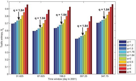 The normalized Tsallis entropies calculated at the five time windows, derived after the initial time series was divided into five shorter time intervals as shown in Figure 1, for ten different values of the entropic index q (). On abscissa it is noted the central day of each time window. The arrows point to the Tsallis entropies corresponding to .