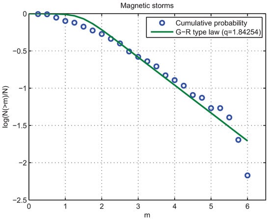 The primary question we can ask in the context of complex systems theory is whether the aforementioned nonextensive laws not only successfully describe the magnitude distribution of earthquakes in the Earth but also magnetic storms occurred in the terrestrial magnetosphere [,]. We note that this model for earthquake generation mechanism was also applied successfully to pre-seismic electromagnetic emissions [,] and just recently to Southern California seismicity [].