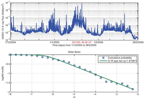GOES-12 5-minute averages X-ray flux, (1–-8 Angstrom) time series (upper panel). The 20 January 2005 solar flare is marked with red. We use the Gutenberg-Richter (G-R) type law for the nonextensive Tsallis statistics (Equation 6) to calculate the relative cumulative number of X-ray flux data, (lower panel). There is an excellent agreement of the aforementioned formula with the X-ray flux time series. The threshold is 10 W/m which results in 141 events, and the associated parameter is .