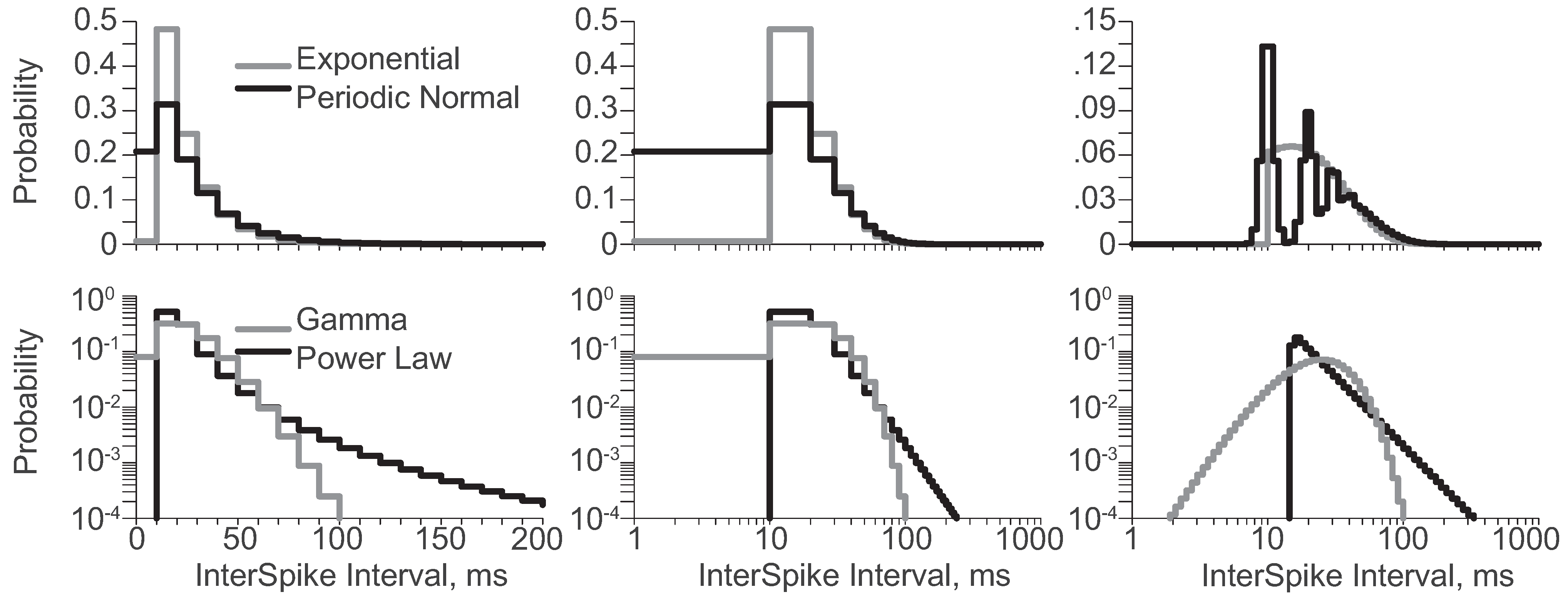 Four idealized ISI distribution functions were used to model neuronal behaviors (Table 1): power law and exponential, long used to model ISIs; gamma, able to adequately characterize ISIs from several distributions [17]; and periodic log-normal, used to model stochastic responses to rhythmic inputs. The distributions were converted to PDFs (Table 2) via taking the derivative of each with respect to t (dF/dt) or the base 10 logarithm of t (dF/dτ). Parameters were selected to yield ISI distributions with a mean of 25 ms (i.e., mean frequency 40 Hz), and a CV between 0.5 and 0.9.