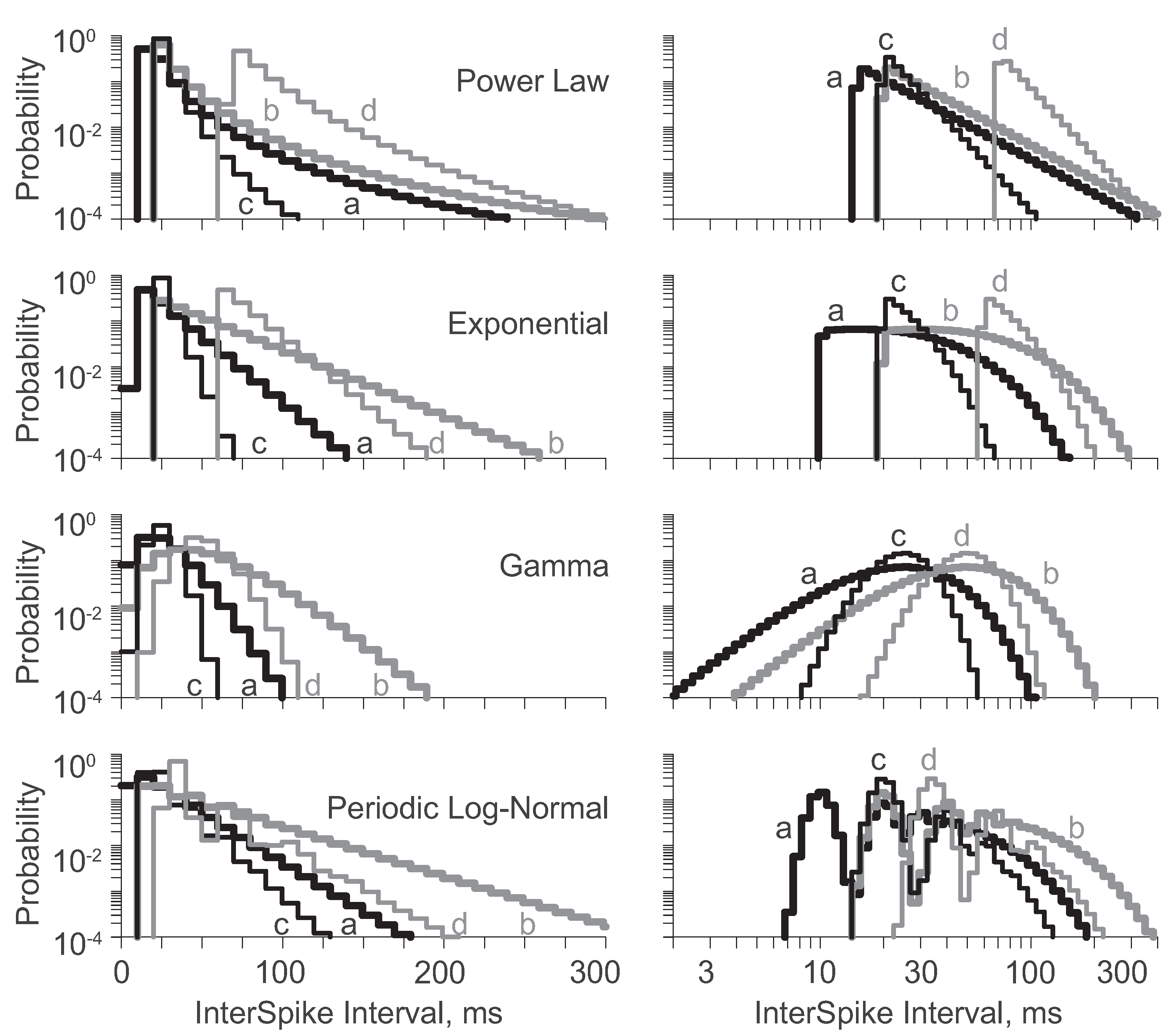 Distributions were constructed from four parameter settings (Table 3). The first row (a) of each reports the original parameters (Figure 1). The second row (b) reports parameters for distributions with a longer mean ISI, but the same CV as (a). The third row (c) reports parameters for distributions with the same mean ISI as (a), but with a reduced CV. The fourth row (d) reports parameters for distributions with the same ISI standard deviation as (a), but the same CV as (c). Final constraints of the power law, exponential and periodic log-normal distributions were that the scale parameters of (b) and (c) equaled each other. The final constraint for the gamma distribution was matching the mean rates of (b) and (d).