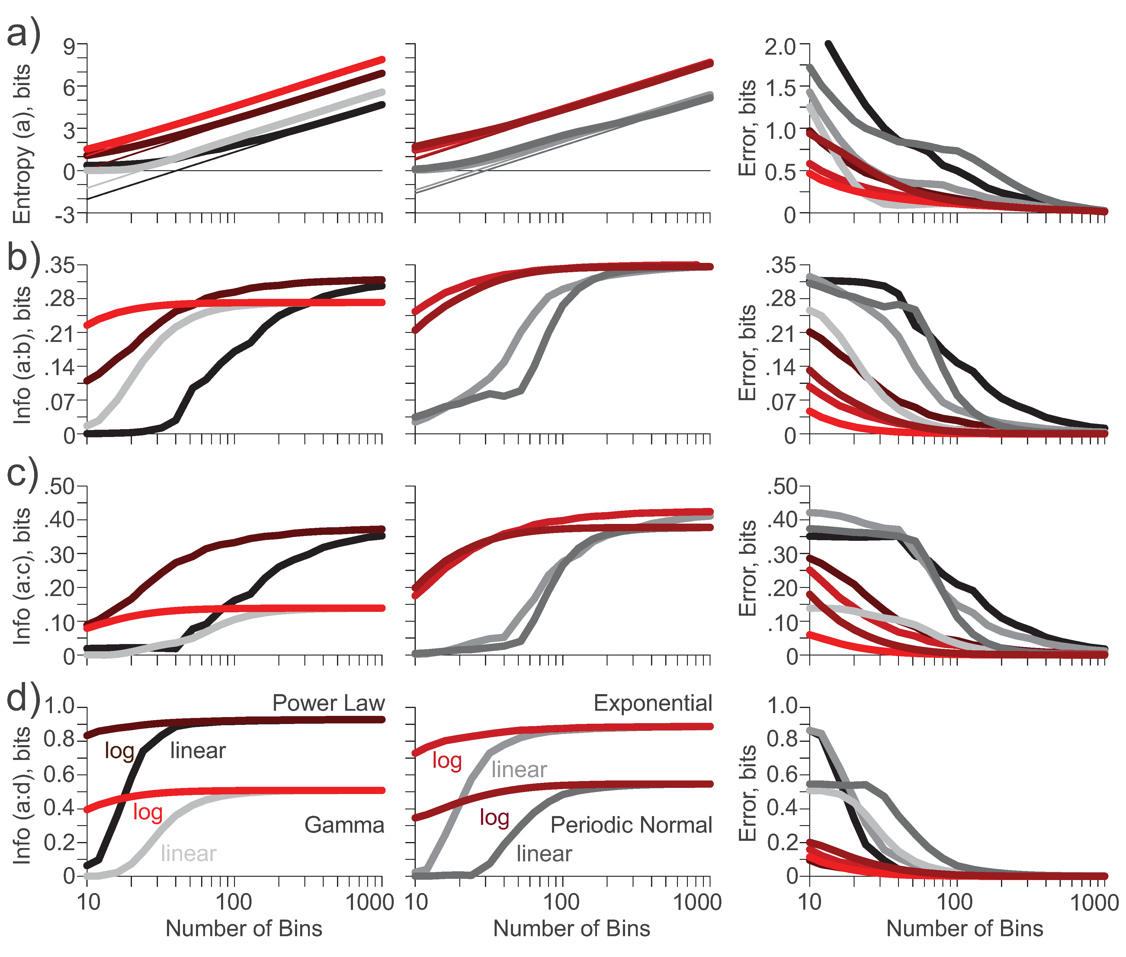 Unlike the entropies, the informations asymptote to a constant value, independent of bin number. Furthermore and thankfully, information calculated from the linear and logarithmic PDFs approach the same value. Thus, we are assured that regardless of our binning technique, we can measure all of the information and report the same values, so long as we have enough bins and enough data to fill them with appropriate probabilities. However, the logarithmic PDFs yield information values approaching the true value with far fewer bins than the linear PDFs in every case. With only 10 bins, most of the logarithmic PDF information values are nearing their asymptote, while the linear PDF information values are essentially zero. Quantifying the distance of an information measure to its asymptote, we calculate the information binning error, also quantified in bits, and introduced by insufficient binning (Figure 3b–d, right). Note that the information binning error nears zero for the logarithmic PDFs by 100 bins. Around ~700 bins would be needed to achieve equally correct information from the linear PDFs.