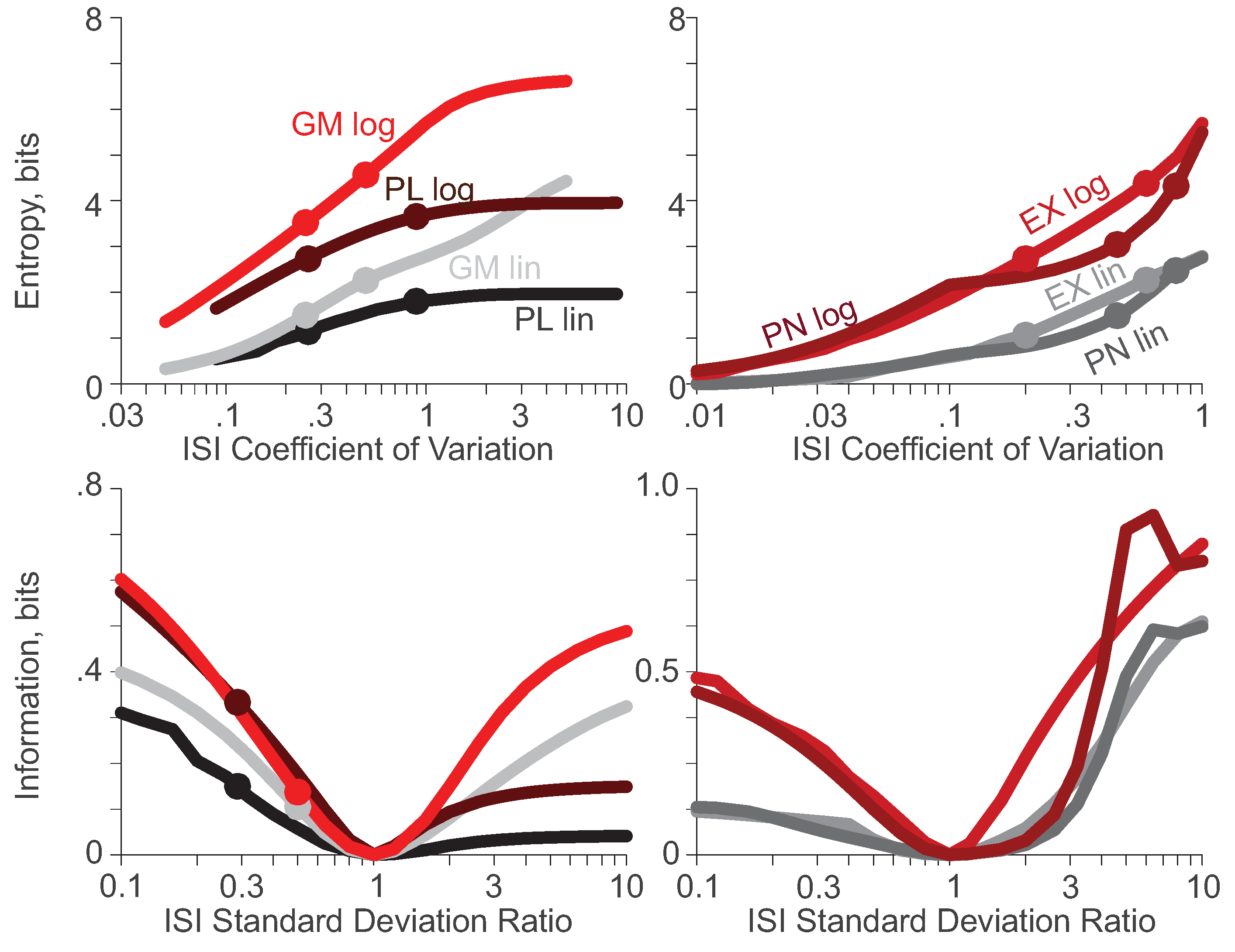 Why do the standard deviations not govern the entropies of the linear PDFs as well as the CVs govern the entropies of the logarithmic PDFs? Because for a given standard deviation, the shape of the PDF is inherently dependent upon the distribution mean. For other distributions with variabilities independent of their mean, e.g., Gaussian, maintaining a constant standard deviation could be used to achieve shifts in the linear PDF mean without changing its shape or entropy. However, that class of distributions is not appropriate for neuronal ISI modeling because whenever standard deviations are independent of the mean, negative ISIs must arise for short enough ISI means. Since ISIs are by definition strictly positive, their distributions cannot have independent mean and standard deviation.